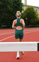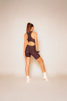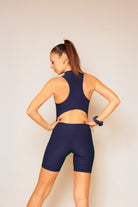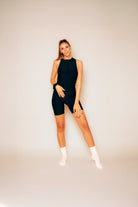 Una tutina leggera, taglio biker sopra al ginocchio, pensata per muoversi liberamente.